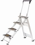 The Little Jumbo 4-Step Ladder folds to a slim 4.7" depth. Steps pivot vertically while the framework tucks together for convenient storage. Little Jumbo ladders are built to the industry's most exacting specifications, incorporating wide, slip-resistant step treads for maximum stability. All models offer safety bars for added security and are made from a rugged, corrosion-resistant aluminum alloy - built to last yet lightweight and easy to handle, with a weight capacity of 300lbs. Tip-n-Pull wheels are added to the back legs for added mobility. 1 year warranty. .